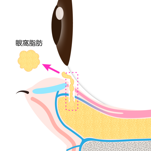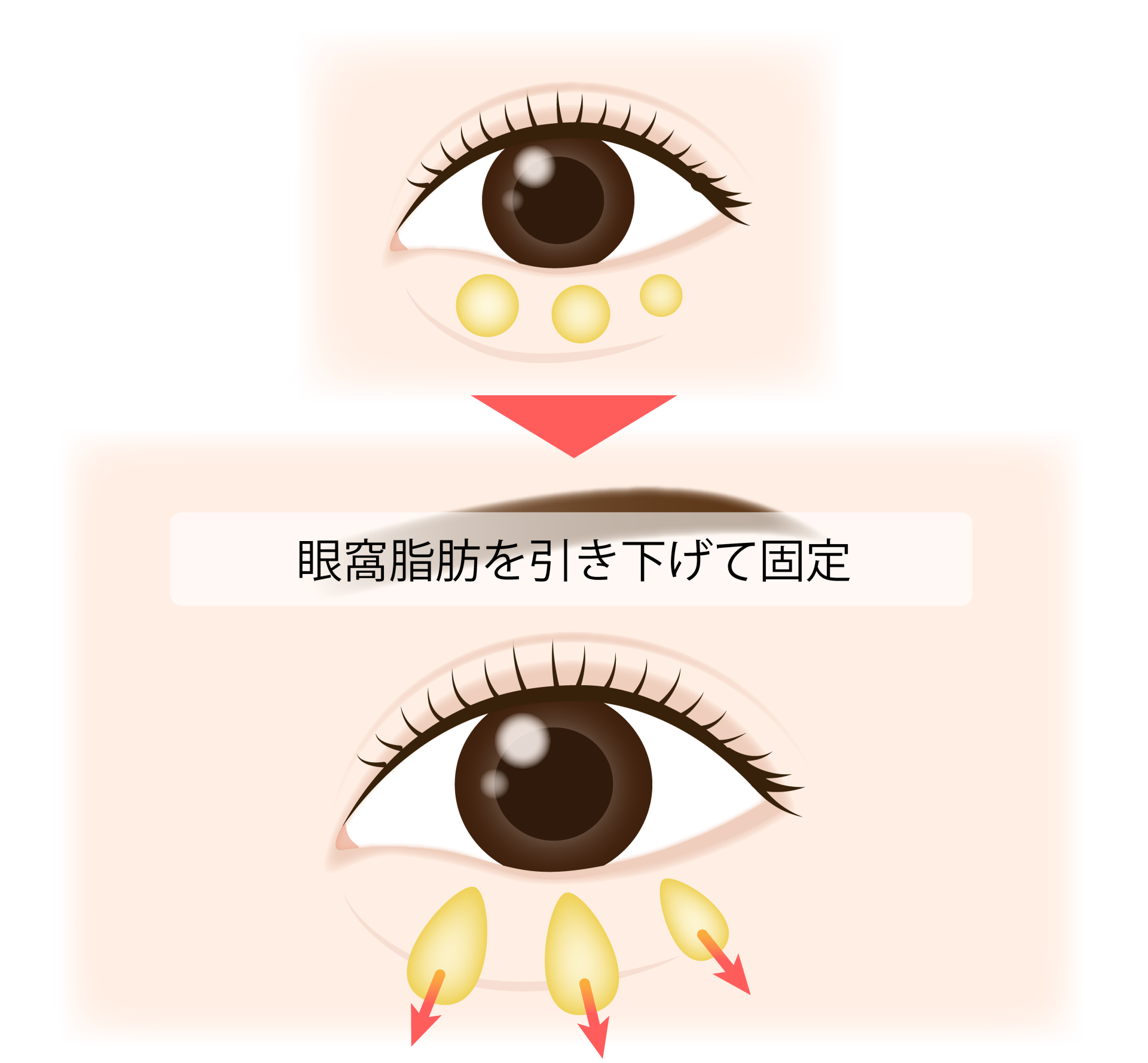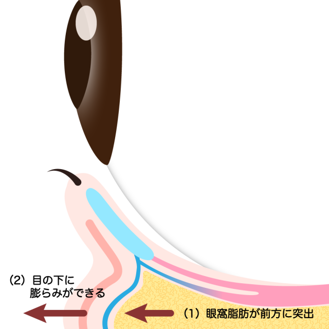 加齢や遺伝などに伴い眼球が重力の影響で落ち込み、押されるように眼窩脂肪が前方に突出します。その結果、目の下にふくらみが生じます。