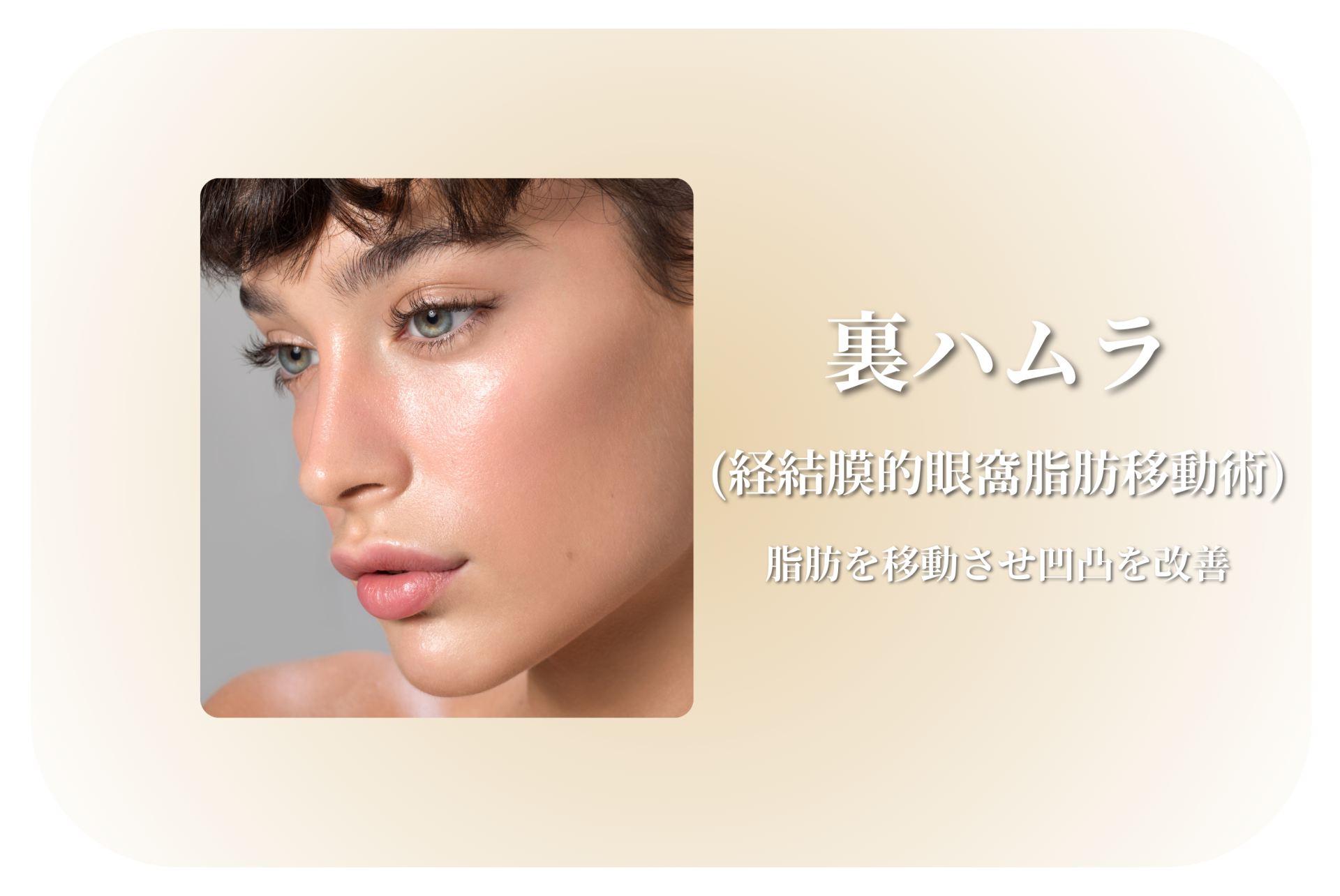 裏ハムラ法は目の下のふくらみである眼窩脂肪を、ふくらみの下の凹んでいる部分へ移動することで、下まぶたの凹凸を改善する方法です。