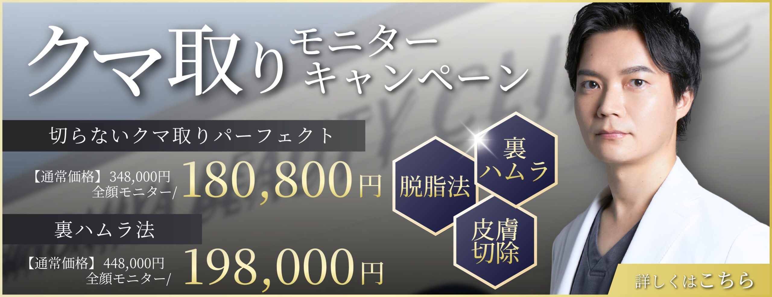 まぶたの裏側からアプローチするためお顔の表面に傷が残らず、ほかのクマ取り治療と比べて施術時間やダウンタイムが少ないのがメリットです。周りにも気付かれにくく、まとまったお休みが取りづらい方でも受けていただきやすい治療となっています。
